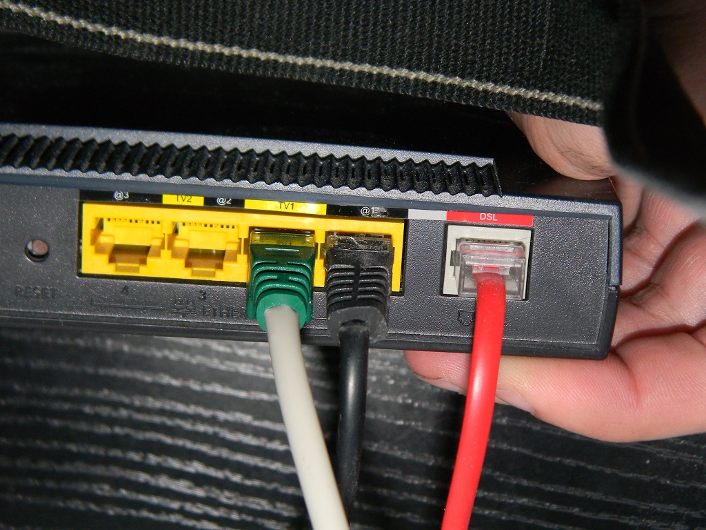 Takhle to mám zapojený v routeru, zelený je ten síťák (do notebooku), černý vede do PC a červený do… nový