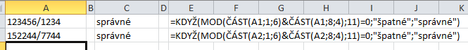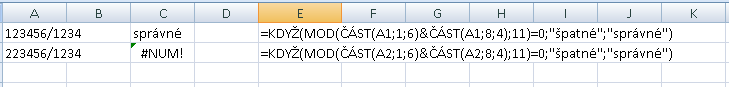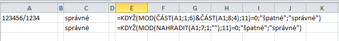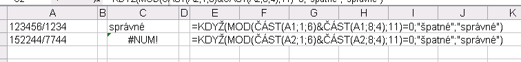 Dobrý den, v Excelu jsem použil funkci KDYŽ která vypadá takto. =KDYŽ(MOD(ČÁST(D4;1;6)&ČÁST(D4;8;4);11)=0;"špatné" ;"správné")