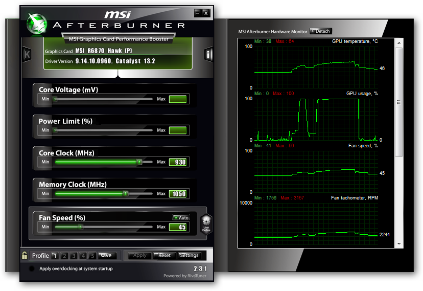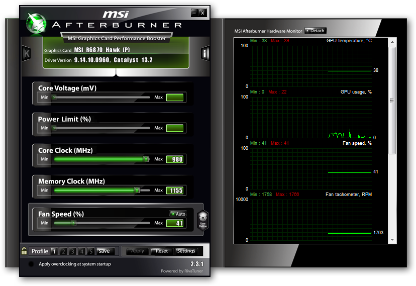 Zkouším potaktovat svou kartu bez zvyšování napětí,nechci ji moc trápit- MSI R6870 Hawk