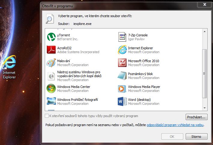 vyberte program, ve kterém chcete soubor otevřít ... iexplore.exe