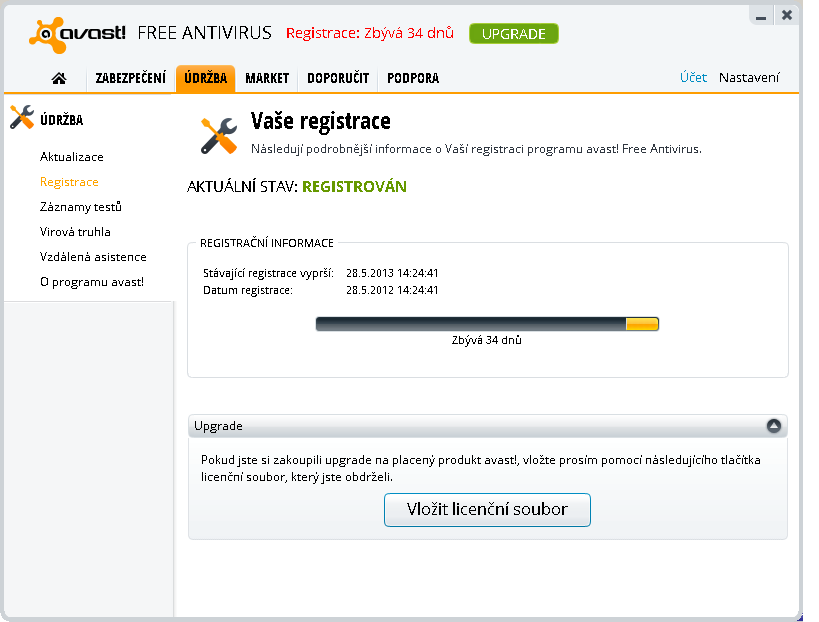 Otevřu Avast - Údržba - Registrace a tam vidím, že současná licence končí za 34 dnů a mohu vložit licenční soubor. Bohužel nikde není možnost vložit licenční klíč.
