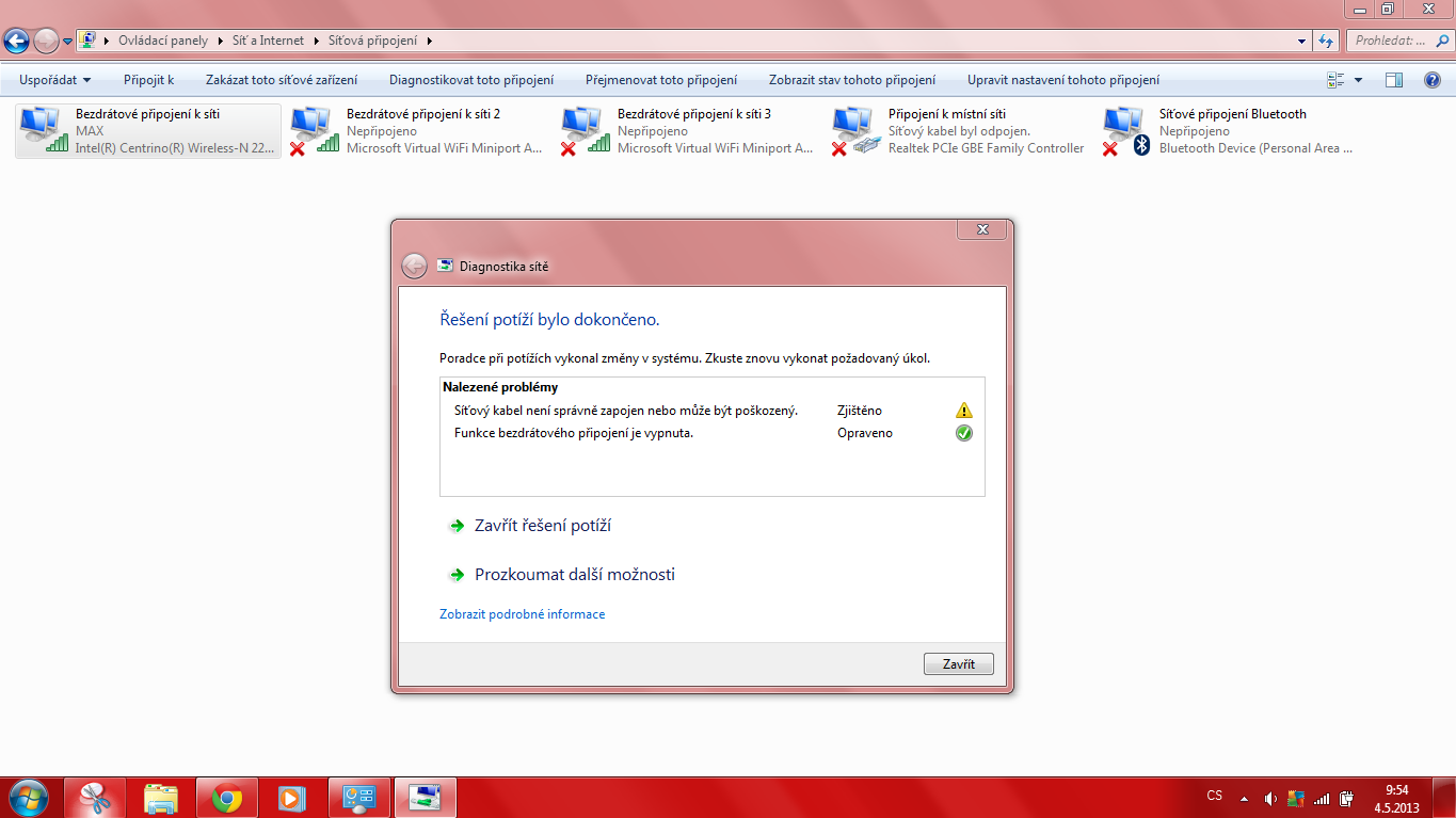 když se ten intel wifi centrino dokáže připojit - viz vlevo nahoře, proč mu dokola přeinstalováváš o… poslední