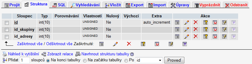 Existuje třetí tabulka skupina_obsah, která obsahuje vazby mezi tabulkami ID - address_book a ID - skupiny.