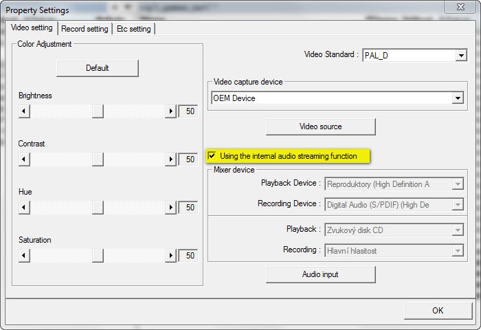 Tak si zozente spravny program a ovladace od vyrobcu. Alebo ste nenainstalovali vsetko co bolo potreba. Ked tam nepomoze ani to use PCI audio a nic ine sa neda vybrat v Active Device, a spravny SW nemate, tak obist sa to da tak ze nebudete strkat zvuk do toho cinskeho kramu ale strcite si zvuk do line-in zvukovky.