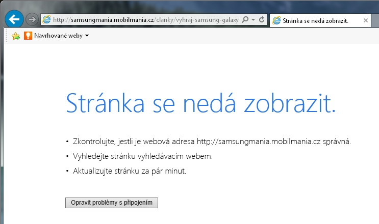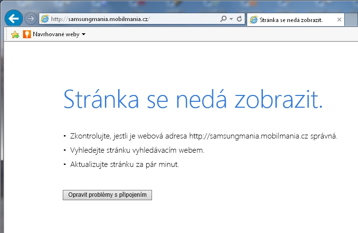 Zdravím a obracím se na Vás s problémem. Na pracovním PC mi při pokusu zobrazit jakýkoliv odkaz na článek z samsungmania.mobilmania.cz z právě otevřených webových stránek (ale i pří přímém přístupu) www.mobilmania.cz prohlížeč IE9 i 10 vyhodí hlášku: "Stránka se nedá zobrazit" a nějaké rady, které k řešení nevedou (hledání řešení skončí zjištěním, že daná adresa nejde převést na IP, nebo tak něco). V jiném prohlížeči (Chrome) je situace stejná. Ani naši IT specialisté si s tím nevědí rady. Přitom na smartfounu přes wifi připojení ke stejné firemní síti, mi ty stránky (v plném nemobilním zobrazení) zobrazit jdou a z PC mých kolegů také. Z toho usuzuji, že je to problém mého PC, ale nenapadá mě, kde ten problém hledat. Máte nějaký nápad? Děkuji za každou radu.