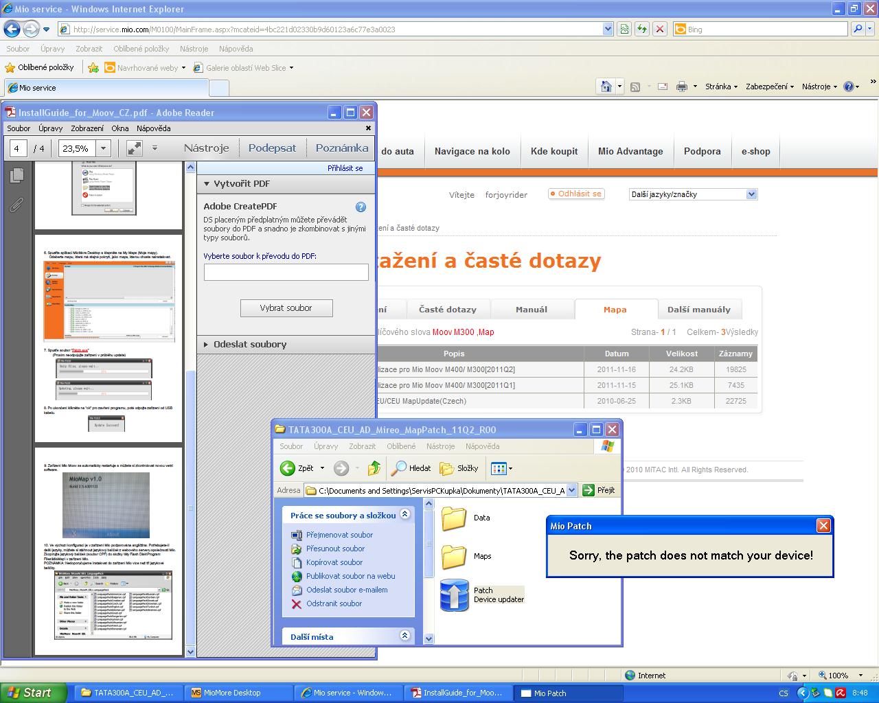 snažím se do navigace MIO M300 dostat novější mapy podle návodu z jejich portálu (mio.com), ale jakmile spustím program patch.exe tak vyskočí hláška: Patch does not match your device.(viz. obrazek) Prosím poraďte co s tím. Navigace je připojena k PC a v pruskumníku je normálně přístupná. Našel jsem na netu, že by mohly být problémy pod w7/64bit, ale pod XP to dělá taky. :( Děkuji za každou radu.