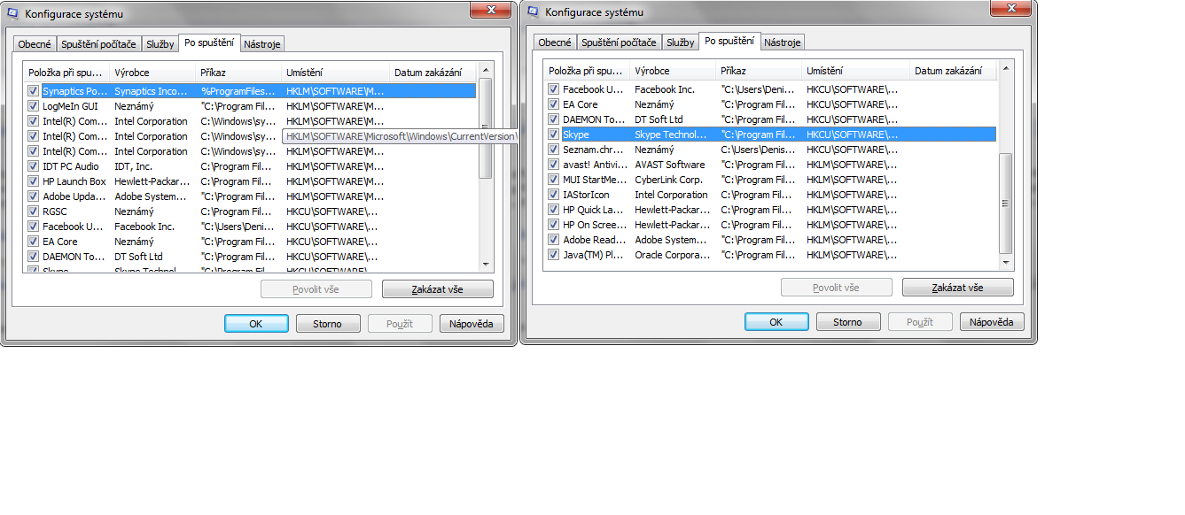Já bych to řešil radikálněji: Všechno zakázat - nechal bych tam jen Avast a Daemon Tools (ani ty tam nejsou nutně potřebné) a zrestartoval PC. Pokud po restartu všechno naběhne (asi by mělo), tak bych ty položky jednotlivě odstranil z registrů (viz. položka Umístění - pozor - pokud nevíš co to dělá, tak na to raději nesahej).