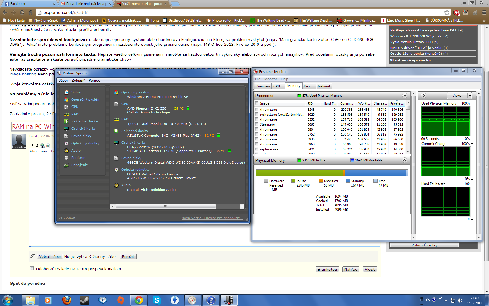 Ahoj mám tu jeden problém s mojim PC. Mám Windows 7 Home Premium 64bit ale ono mi to využíva až vela pamete.. okolo 2GB z celkoveho počtu 4GB a ked sa snažím spustit napr hru Battlefield tak mi vyhodí chybovú spravu s tým že už nemám dost pamäte a nech vypnem aplikaciu Battlefield. počítač mam tiež pmalší od tej doby.. vedel by mi niekto pomoct?? na obrázku nižšie su dalšie informácia.. Vopred dakujem :)