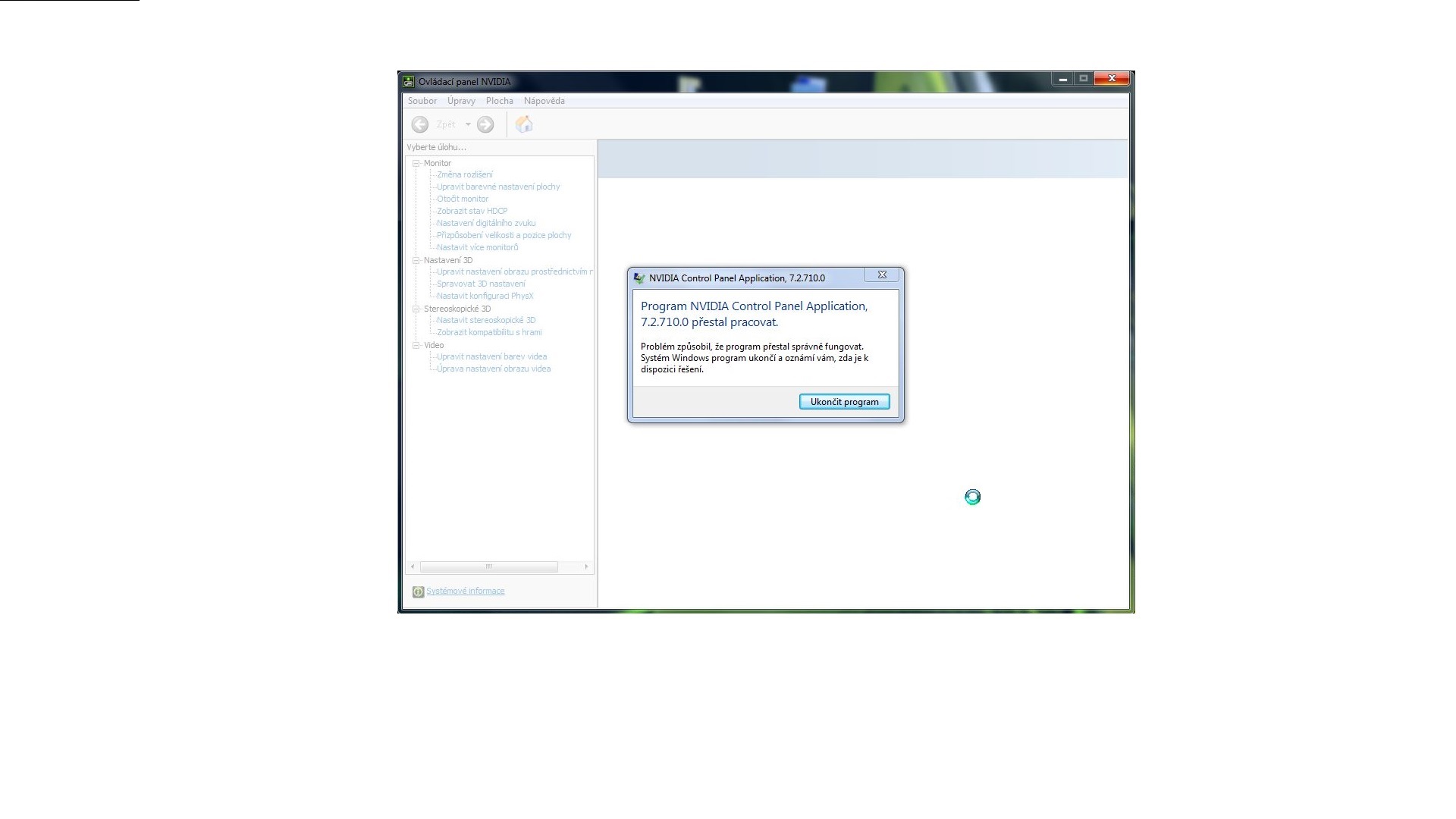 Ahoj, mám takový problém, dnes jsem si chtěl ověřit, jaké mám ovladače na grafické kartě, jenomže jak jsem zapnul Nvidia control panel aplication, napsalo to, že program přestal pracovat (viz. obrázek).