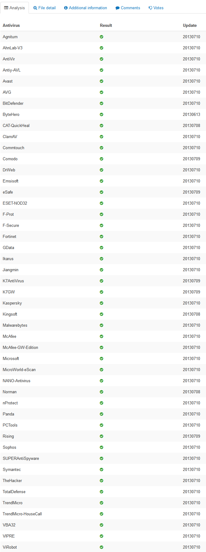 VT skenuje 40+ antiviry. Nicmene je pravda, ze casto AV databaze na lokalu ukazuji u konkretniho souboru jine vysledky, nez ty jejich, i kdyz jsou ze stejnyho data.