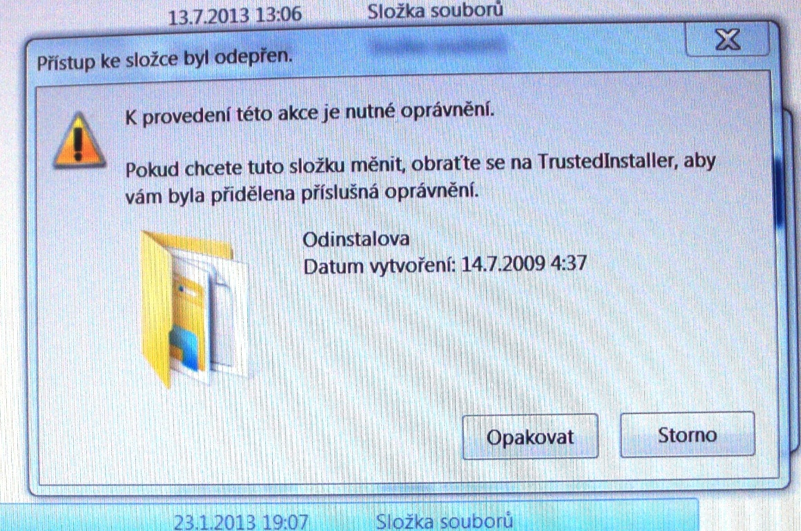 Co to hlásí doslova? Zkontroluj oprávnění - pravý klik/vlastnosti. Taky můžeš zkusit spustit Průzkum… poslední