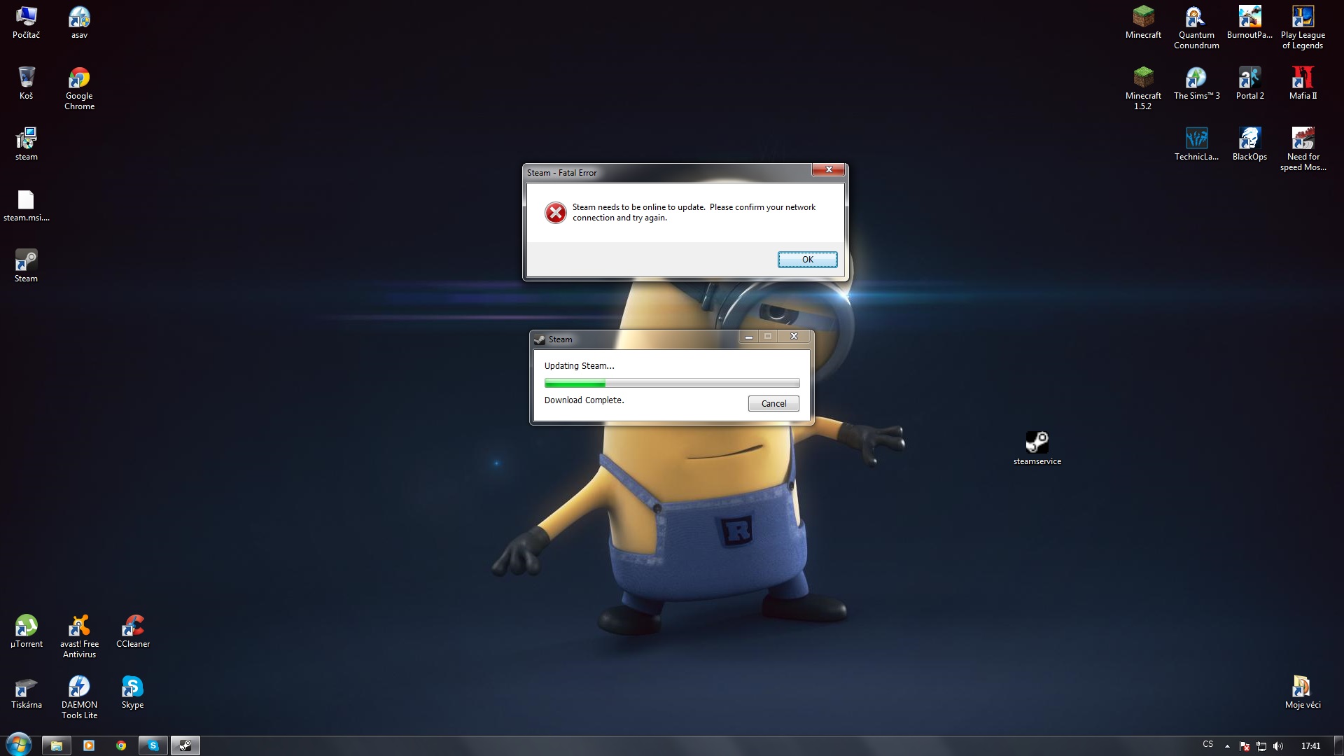 takový malý problém se nově vyskytl. Když z offiko stránky stáhnu Steam a nainstaluju tak se po instalaci sám updatuje. Jenže nikdy né dokonce. Pokaždé se stáhne jiné množství updatu nikdy né více než 30MB a naskočí tabulka Fatal error. Steam needs to be online to update.