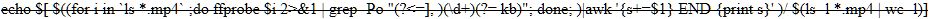 (for i in `ls *.mp4` ;do ffprobe $i 2>&1 | grep -Po "(?<=], )(\d+)(?= kb)" ; done; )|awk '{s+=$1} END {print s}' udělá sumu.