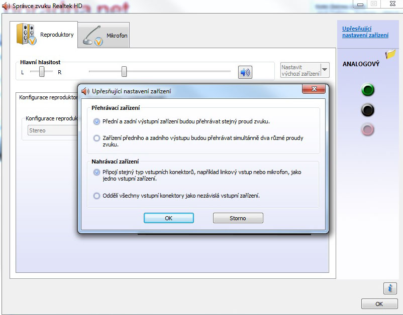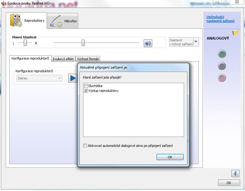 Nikde "vypnout automatickou detekci konektorů" sem nenašel. když poklepám myší na černý konektor tak se mi objeví tabulka viz obr. jde to jen přecvakávat ale nic to nedělá, vždy jen na půl sekundy zahrajou reproduktory.
