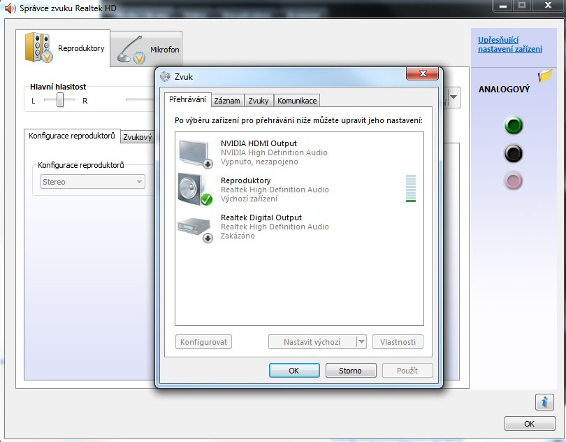 Tak skus odinstalit ovladac zvukovky, restart, a znova nainstalit. Mozes skusit aj inu verziu ovladaca, kludne aj najnovsiu z www.realtek.com (vpravo kdesi tam je hned na hlavnej stranke link na HD audio codec driver)