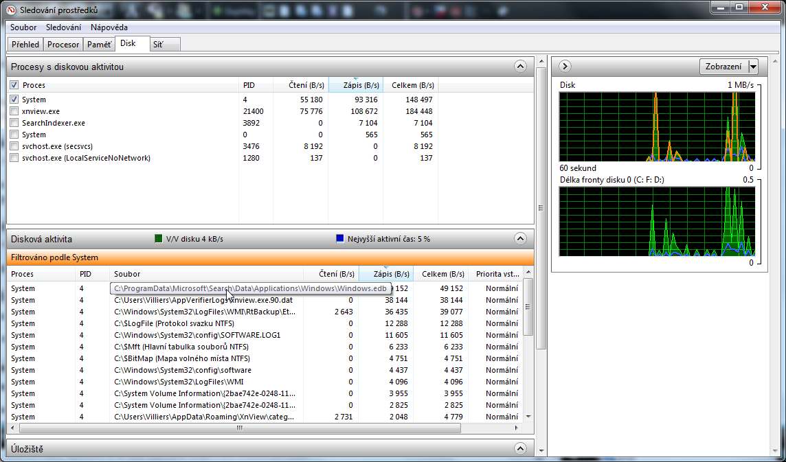 tady jde spíš o to, zjistit co vytěžuje. nahoře zaškrtni první tři nejaktivnější procesy (čtení, zápis= celkem) a dole roztáhni sloupce tak, aby bylo vidět u čeho to dělá, třeba to bude hledatelný.