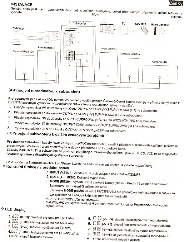 Dodatek: Z návodu jasné, že lze připojit buď příslušný zdroj signálu 5.1, nebo zdroj signálu stereo. A pak lze přepínat mezi zdroji signálu.