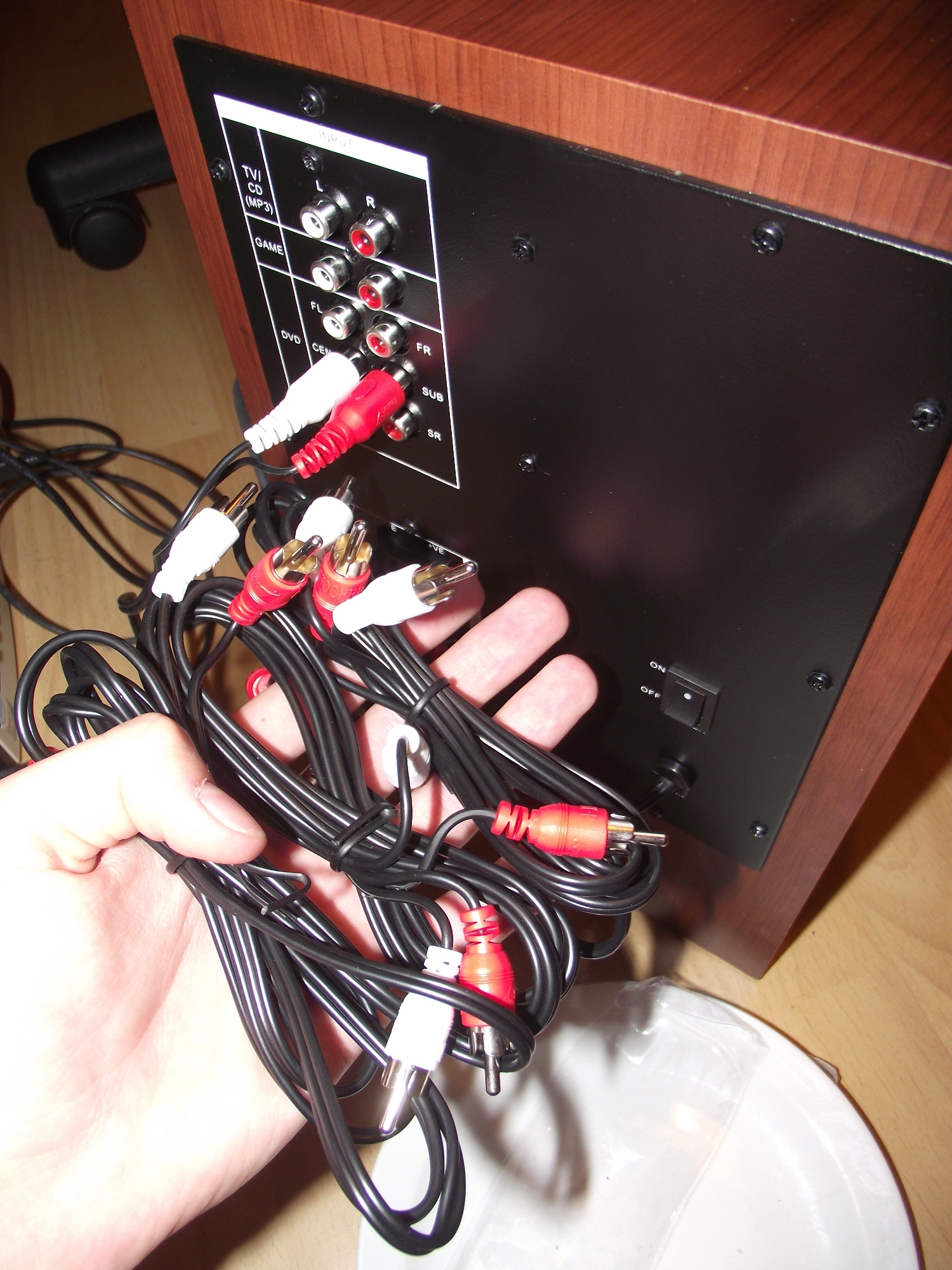 Takže ještě jednou nahraji fotku ze zadu od subwooferu, jdou tam vidět všechny výstupy/vstupy a konektory - jeden s jackem, ten co je zapojen zezadu v subwooferu, vede na konec k zelenému JACKU. Ostatní konektory RCA jacka na konci nemají - tak jak to mám asi tak zapojit do PC? :D