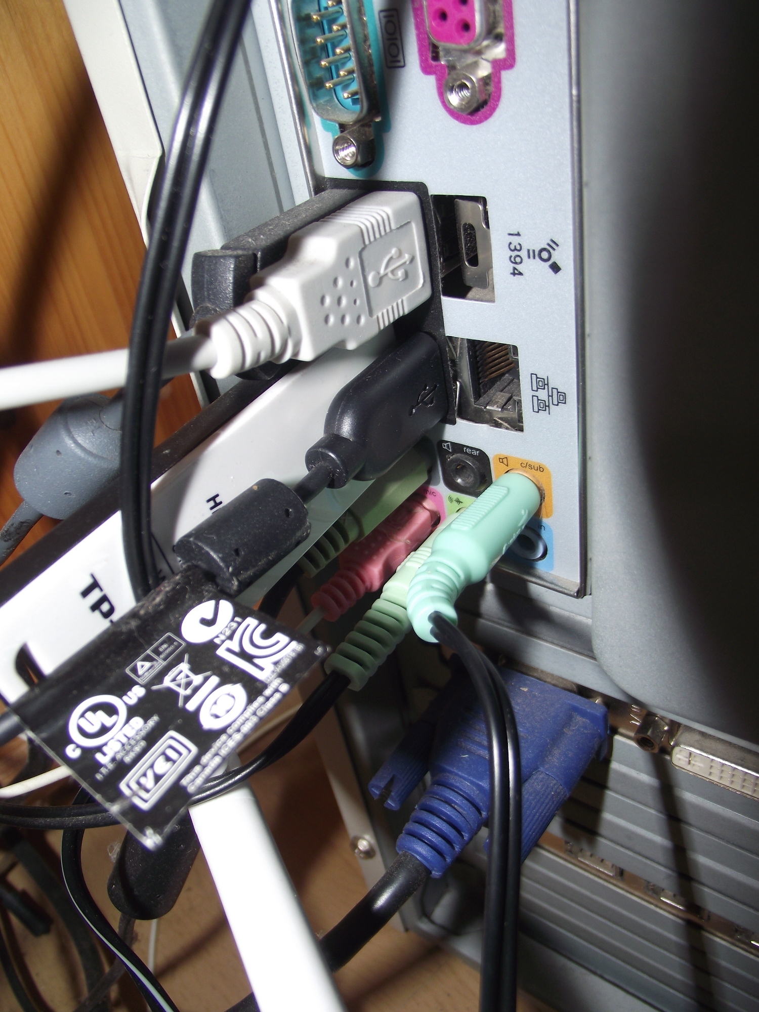 2) fotka ze zadu PC (mám tam připojené nejen toho jacka ze subwooferu (ale kromě toho zeleného) další, tj. Ještě bedny staré, abych mohl poslouchat hudbu, než sprovozním ty nové 5.1, dále repráky z monitoru, mikforon...)