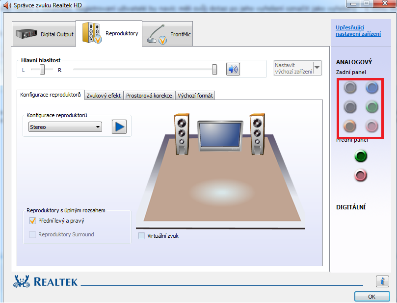 Promin já tím jen myslel že zapnutá detekce by nemusel být ten problém. Protože když to předtím vždy ukazovalo kde mám jaký konektor připojen, tak to přece musí ukazovat pořád. Navíc našel sem i na jiném foru stejný případ akorát se jednalo o novou desku. Také se jevil jako aktivní pouze přední panel. Jde o stejný zvukový kodek Realtek ALC892.
