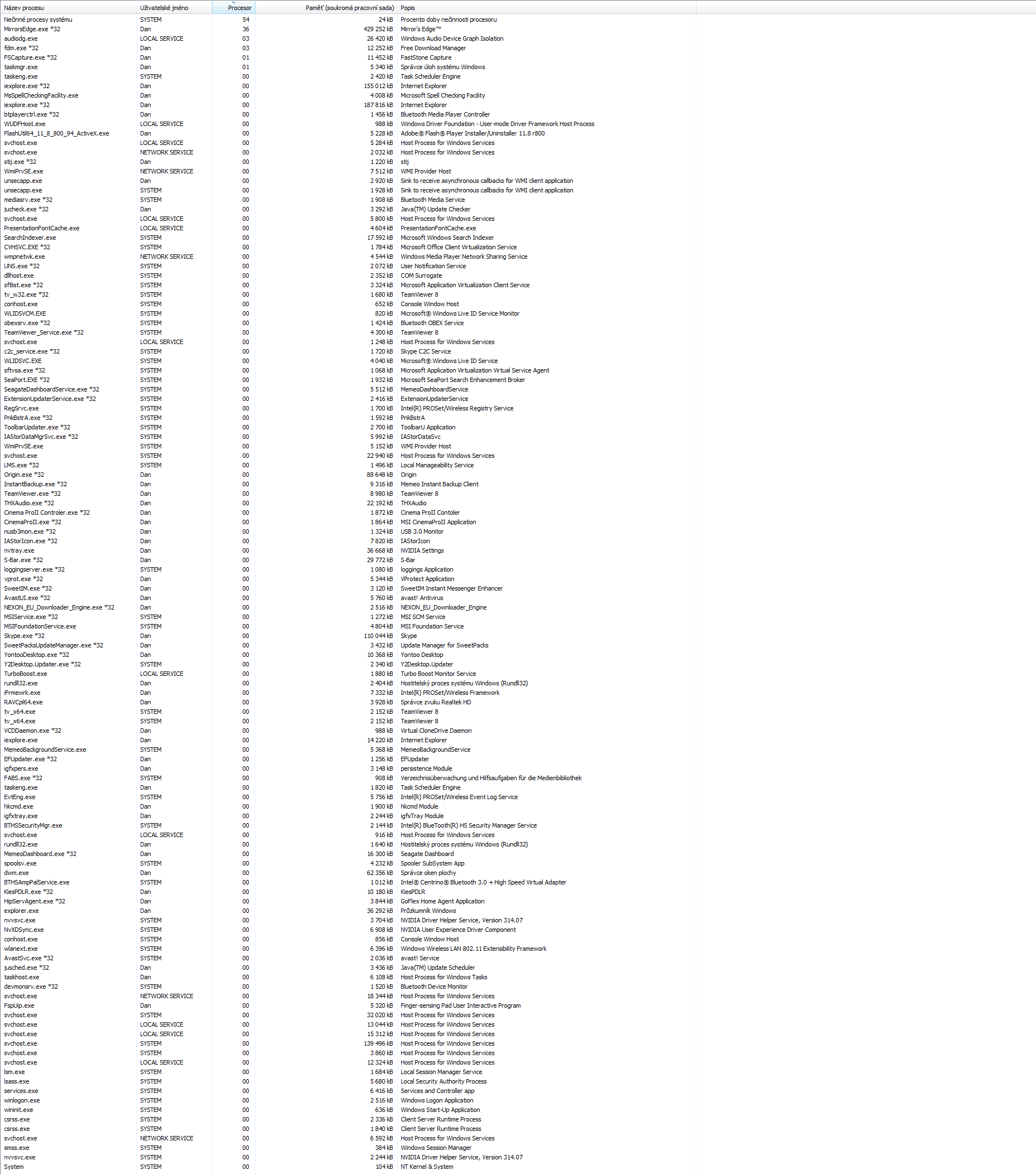 OT: Kouknul jsem na to, a říkal jsem si jak na tom jsem asi po půl roce reinstallu OS já. Procesů mám 50. Svůj správce jsem zavřel a chvilku koukal na ten tvůj. Pak jsem někam překlikl a po chvíli zase otevřel stránku s tebou nahranym obrázkem. A zalekl jsem se a nahlas řekl "tyv*le co mi tak vytěžuje procesor?? co ta paměť??!. Klikám na křížek a nic. Řikám si, "sakra ted se to hryzlo celý.." (a po 5 vteřinách mi došlo, že je to vlastně ten tvůj TaskM.. :D" Omlouvám se za OT, ale docala jsi mě tím pobavil.