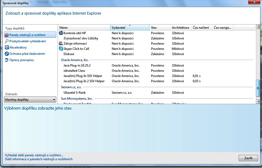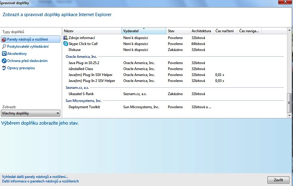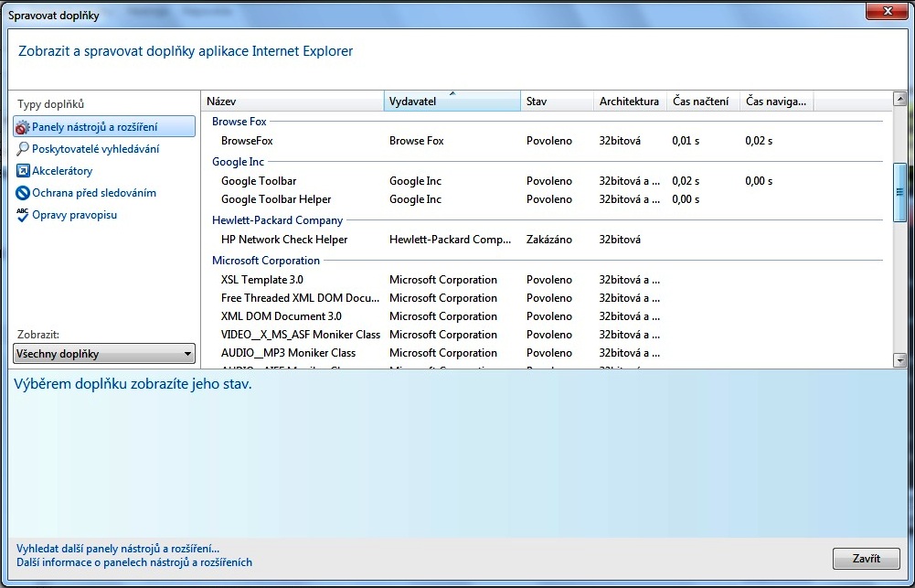 menu nástroje (l-core to má "za rohem") - spravovat doplňky - povolit/zakázat - kliknout do povolených a nežádoucí pozakazovat.