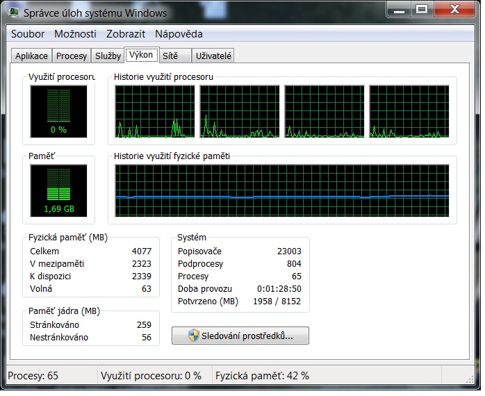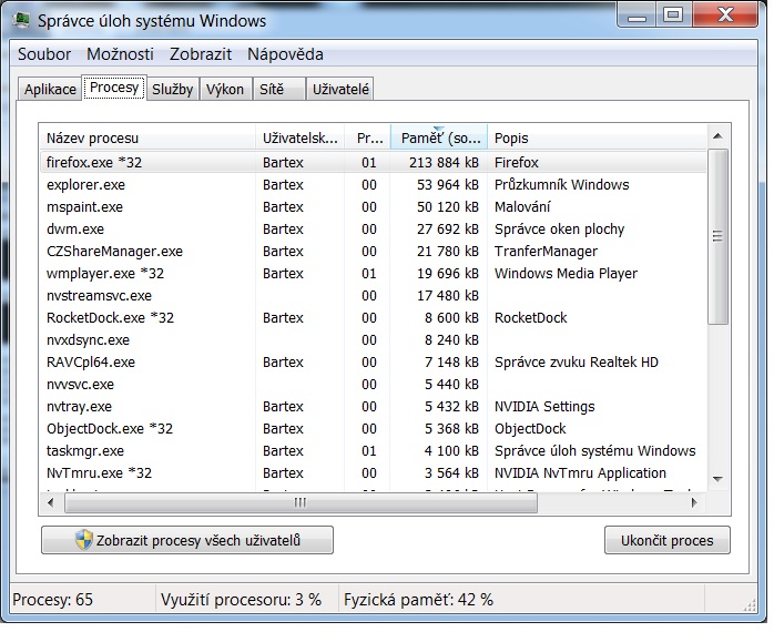Nový driver grafické karty, aktualizovat vešekeré zásuvne moduly, které se mi ve FF objevují. Aktulizaci flash a shockwave playerů. Nechápu, co více by na to mohlo mít vliv. FF je aktuální. Pozoroval jsem, zda při zásecích je zvýšené vytížení CPU... (dodávám screen) V době záseku nedošlo k žádnému vychýlení křivky! Ty vlnky, co se tam objevují, jsou například spuštění WMP. Ihned po záseku jsem hypnotizoval CPU a s vytížením 1% opravdu nevěřím, že to je ono. Vždy, když se toto stane, koukám do procesů, ale i zde nic(rovněž dodávám screen).