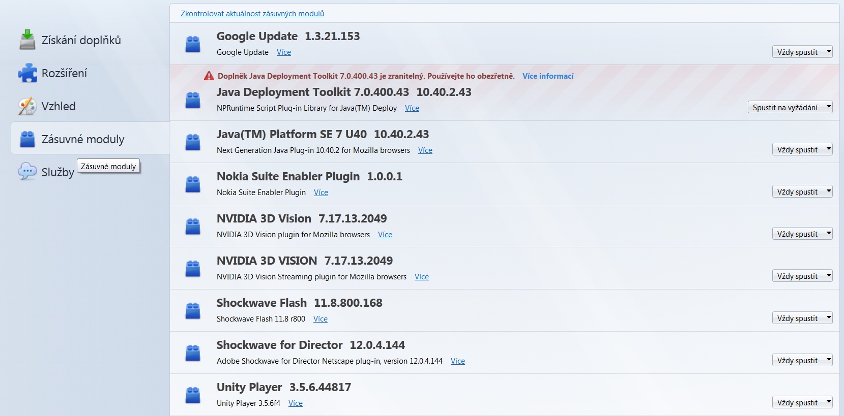 Do přílohy vkládám seznam zásuvných modulů a doplňků, co ve FF mám... abych pravdu řekl, moc se v těch zásuvných modulech nevyznám...