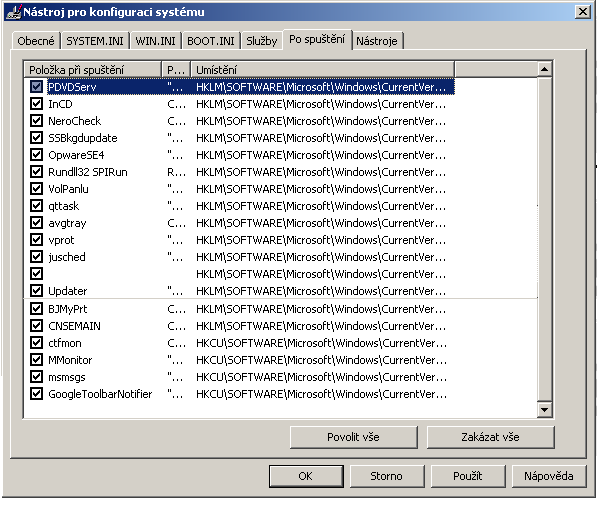 screen z msconfig ukazuje dlouho střádaný zbytečný sw i pravděpodobný spyware (podezřelý rundll cosi) - celý spouštěný příkaz ti vypíše třeba log hijackthis.