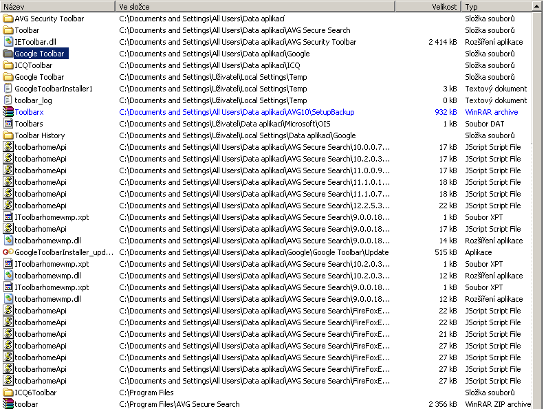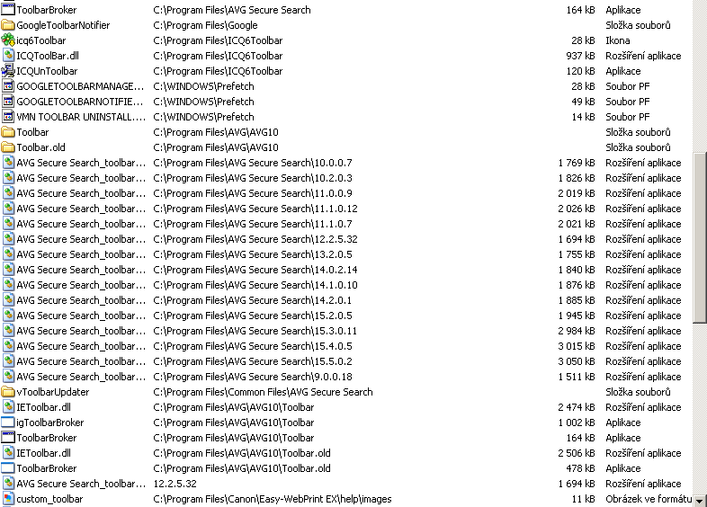 Vyhledala jsem všechny soubory obsahující toolbar v názvu a mám tu toho víc než dost. S těma rastrovýma obrázkama a podobně ztrácet čas nechci. Chtěla bych ale odinstalovat nepotřebné toolbary. Je tu ještě nějaký?