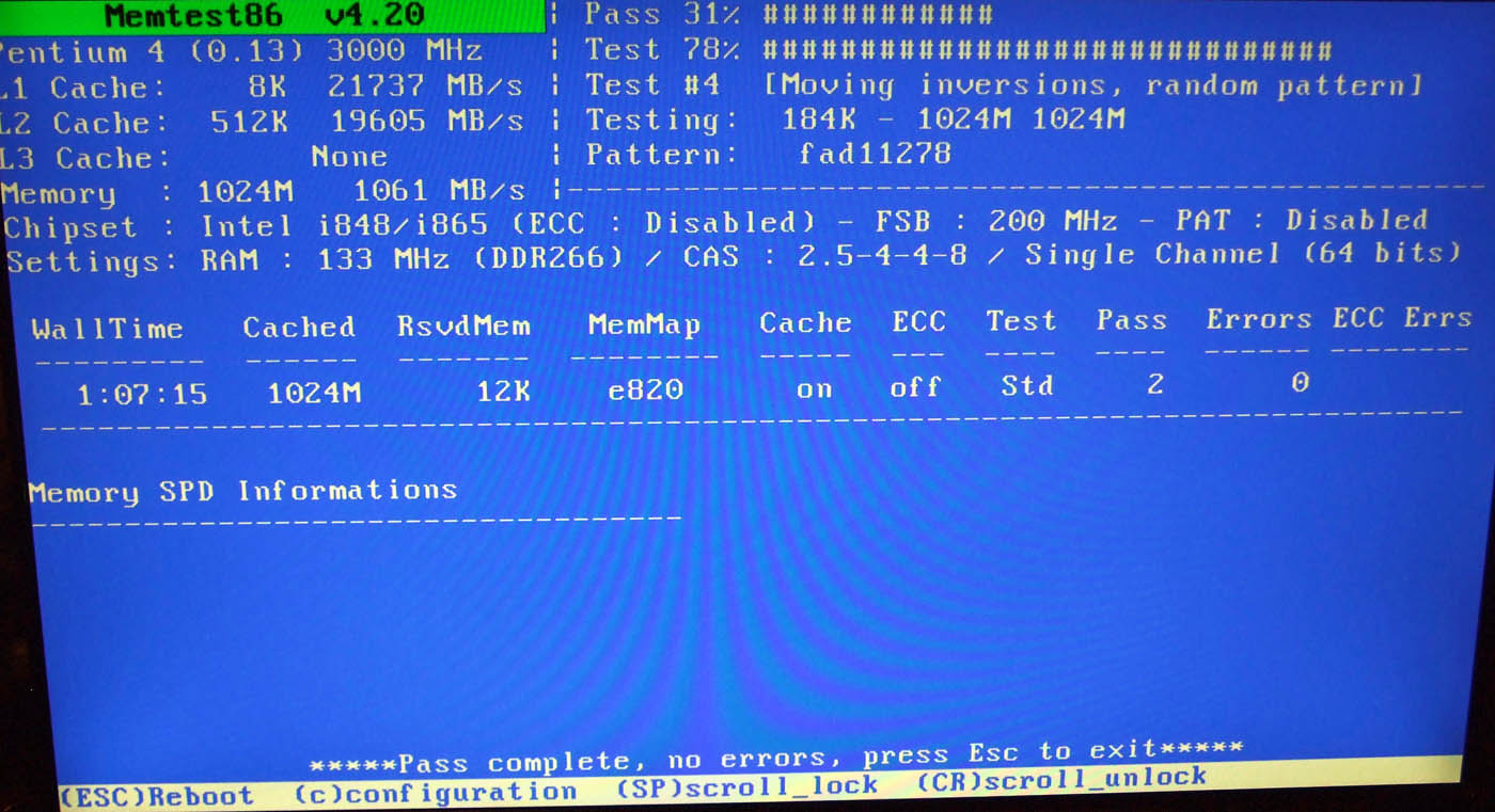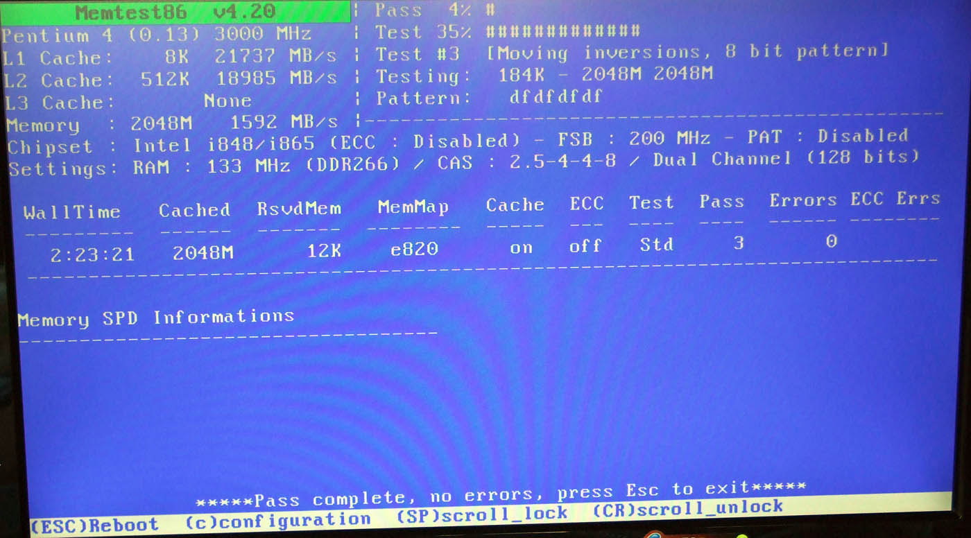 Tak jsem zatím otestoval RAM1 slot1 a RAM2 slot2 každou zvlášť a žádné errory. V příloze jsou vyfocené obrazovky. Teď testuji obě RAM, až to bude hotové dám to sem taky. Ještě jsem vyfotil print screenem program CPU-Z, ale mám to v starém PC a teď se k tomu nedostanu, takže to sem dám potom, až skončí Memtest obou RAM.