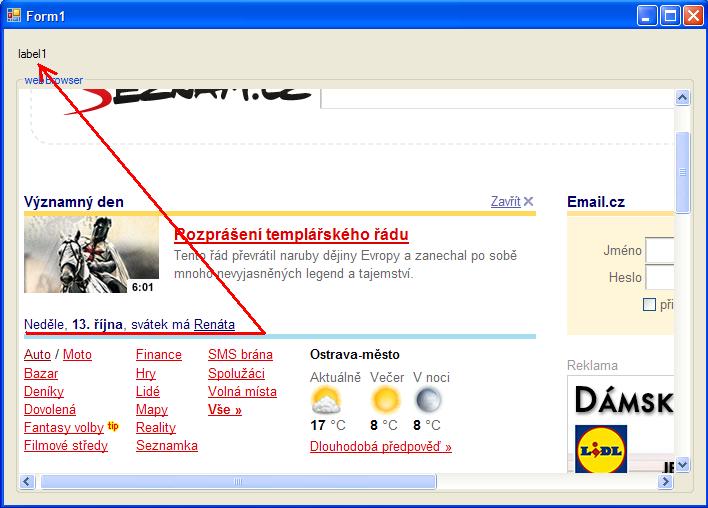 Zdravím, chtěl bych se zeptat zda by mi nekdo neporadil jak propojit webBrowser1 z label1(všechno je ve form1. myslim to tak že když se mi zobrazi webBrowser tak se mi v label vypíše text ktery je na webu. např seznam.cz tam má datum a jmeno kdo ma svátek tak aby se mi to v label vypsalo. zkoušel sem stryčka googla ale nikde nic :(