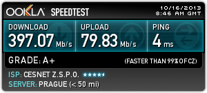Zkoušel jsem toho víc. Rychlost.cz má výsledky kolem 150 Mb/s +/- 50. Dneska jsem si pokusně stáhnul nové Ubuntu a jelo to na těch téměř 400 Mb/s. Ten Speedtest běžel z Prahy do Prahy, takže to doufám nebere mezinárodně.