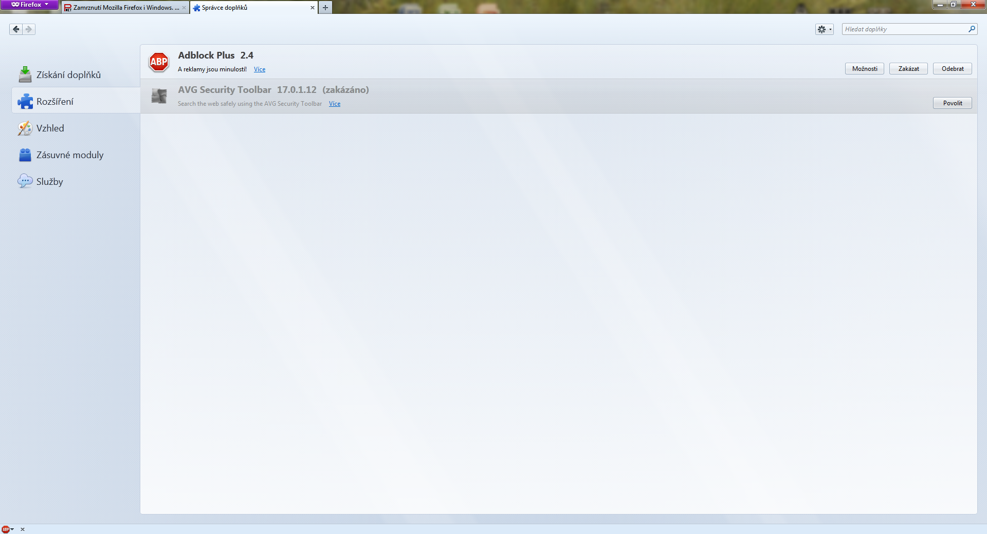 Já jsem to všechno pozakazoval, a nechal jen tohle dám sem dva obrázky jeden jsou rozšíření a jeden zásuvné moduly. Stane se to asi hlavně při facebooku a když se mi firefox nahodou podaří vypnout, tak je kurzor celý pomatený, zasekne se třeba na podobě I (když ho mám tady v textovém poli), nebo na tom kolečku, nebo na ruce. A když dám Ctrl+Alt+Del tak asi na vteřinu zčerná obrazovka pak se objeví ta nabídka u WIn7 co chci udělat.