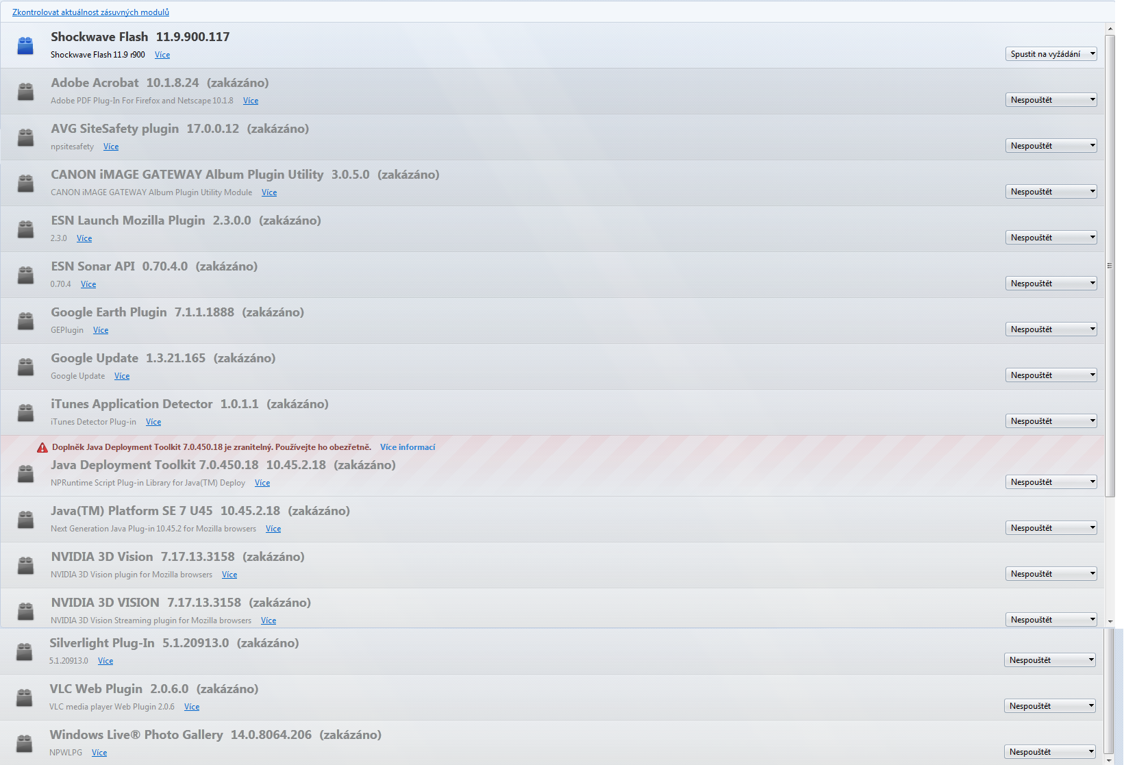 Tam je položka: Rozšíření a v něm je adblock a potom položka zasuvné moduly a tam je třeba shockwave flash 11.9.900.117, java deployment toolkit ..., asi jsem to nepochopil.