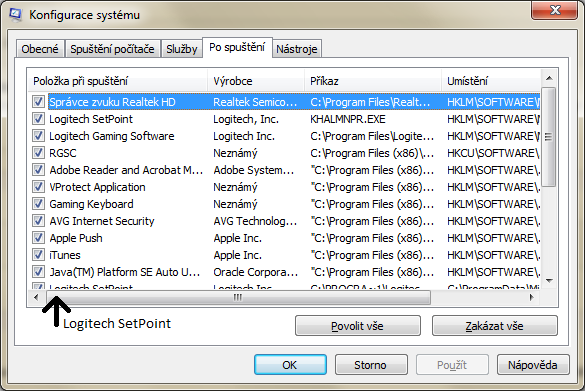 Tady je ten screen, tam dole to co není vidět je Logitech SetPoint, program na herní myš od Logitechu. Jinak níž už je to všechno nezakřížkovaný.