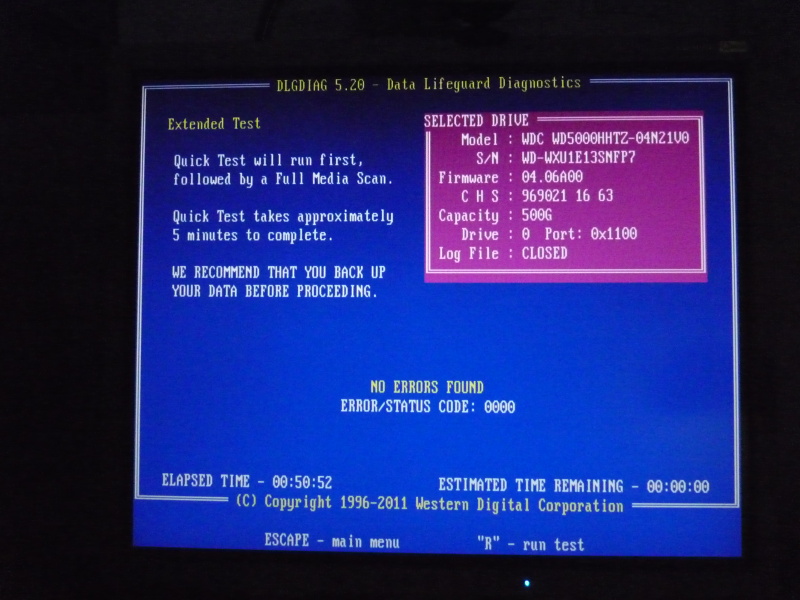 Test z UBCD nešel, tak jsem stáhnul a spustil verzi pod Win (ze stránek WD). Rychlý i kompletní test…