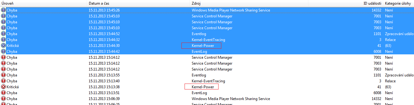 Osobně údajům v prohlížeči událostí nerozumím, takže nevím co to znamená. Od 2.11 do 15.11 je tam tato chyba celkem 9x, což by odpovídalo počtu freezů.