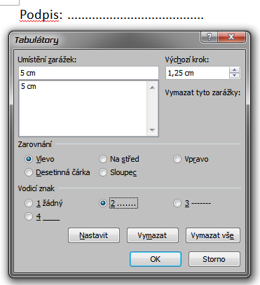 6, otvoril nastavenia odsek > karta Zarazky a medzeri > Tabulatory, vybral vodiaci znak