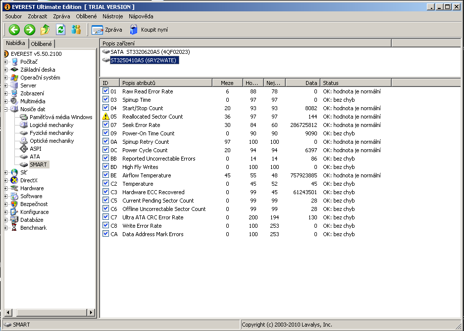 Tak, jsem tu rychlost proměřil ještě jednou a teď to zase dopadlo lépe bez jumperu. Nevím, jestliže na tom nezáleží, tak proč to jednou vyjde tak a podruhý jinak? Měl jsem za to, že ten jumper by měl být nastaven podle toho, co podporuje ZD. Čili připojuji li HDD k základovce, která podporuje 3G/bs, tak to samé nastavím na disku. Přikládám smart.