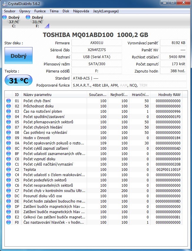 To vypadá, že disk jako takový by měl být OK. Závada tedy může být v tom USB připojení. Jak disk připojuješ? Zkus jiný USB port. Na některých bednách jsou s předními USB problémy. Pokud máš na PC (NB) i USB3.0 porty (bývají pro rozlišení v modré barvě), tak bych preferoval pro připojení ty, protože zařízení do nich připojené má k dispozici větší napájecí proud. U PC by také mohl být problém v napájecím zdroji, protože USB porty bývají často napojeny na větev +5VSB, která je takovým samostatným zdrojem ve zdroji, takže i když PC normálně funguje, tak napětí této větve může být mimo tolerance. Zkoušel jsi disk i na jiném PC?