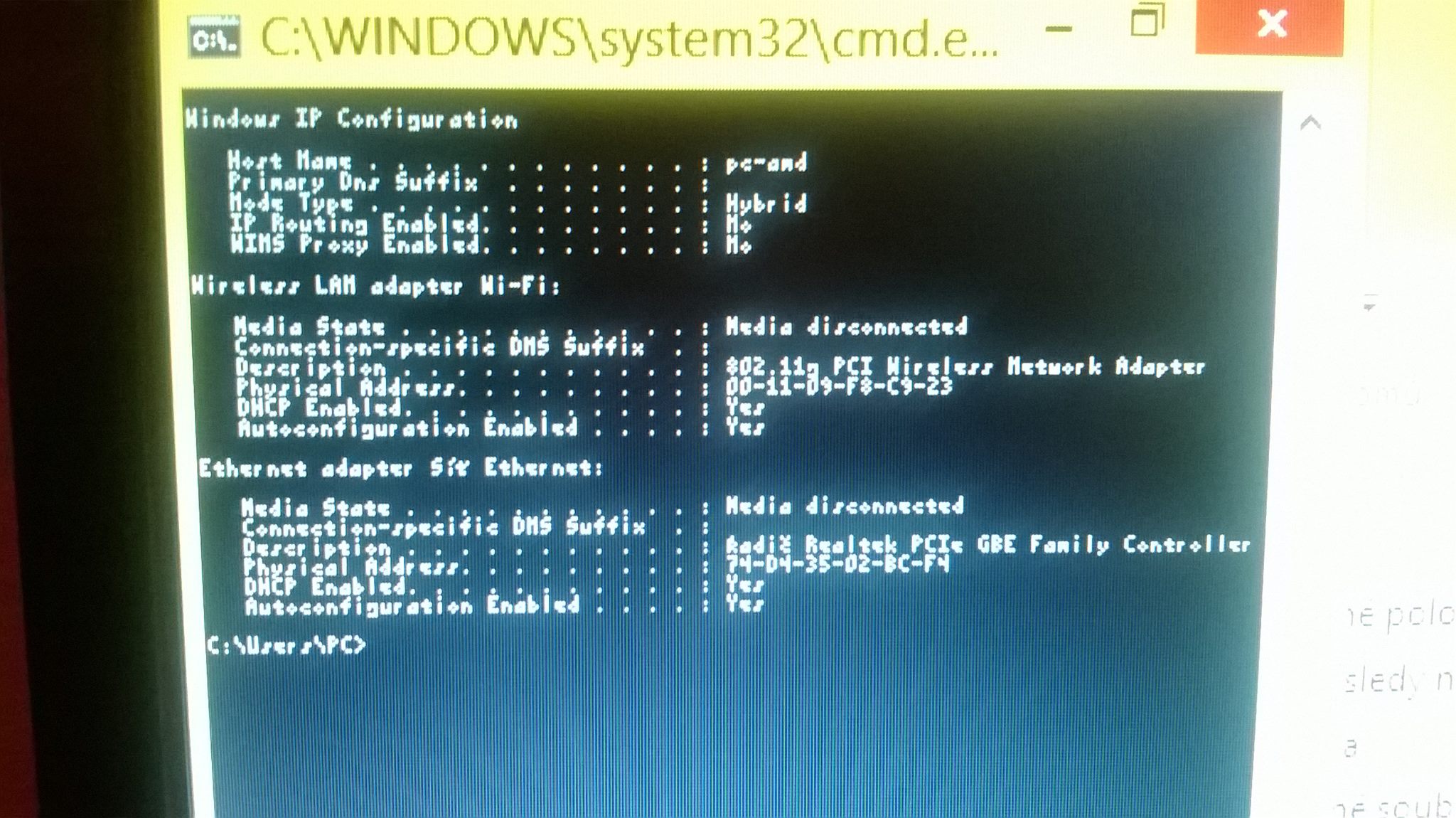 ve výpisu ipconfig existuje síťové připojení s funkční(?) wifisíťovkou, viz mac adresa.