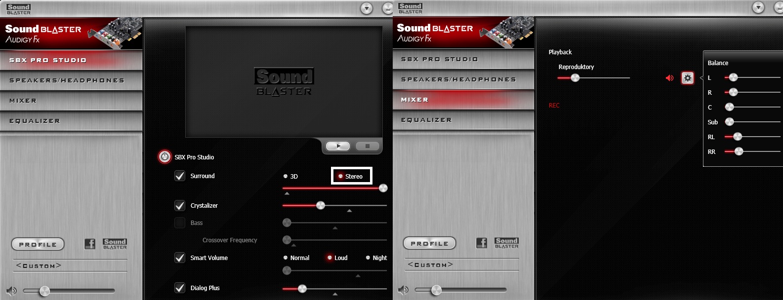 mam problem když pustim mp3 nebo youtube tak hraje samozdřejmě jen stereo ale já bych to chtěl roztáhnout na vsechny repra tak abych to slyšel i zezadních repráku funguje mi to jen u efektu ale to zni divně