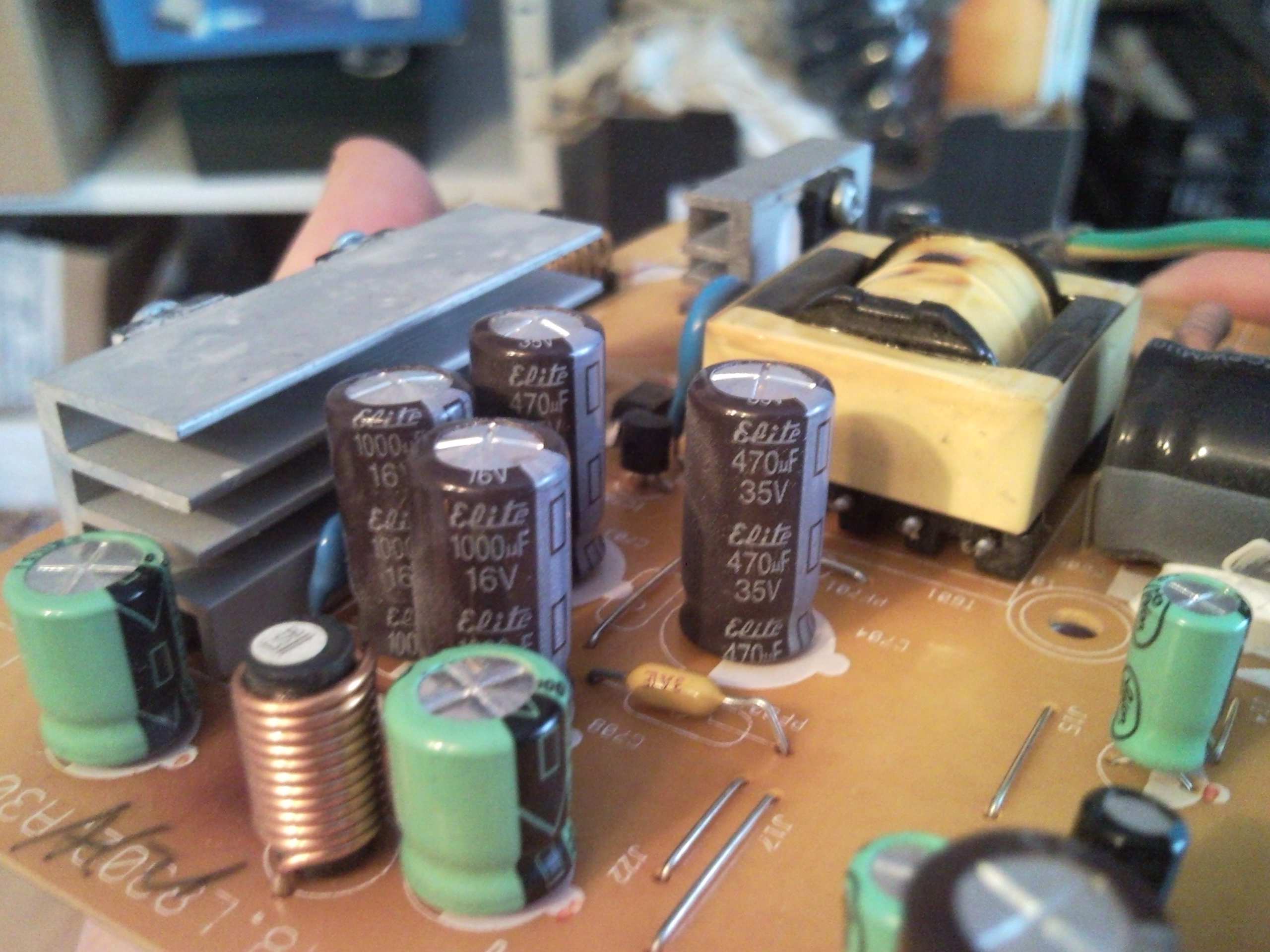 mám problémy s monitorem. Začne fungovat, až po 30tém zapnutí, do té doby svítí jenom bíle. Rozebral jsem jej a nelíbí se mi kondenzátory 470uF 35V, 1000uF 16V EL(M) 105°C(viz.foto). Nevím, zda by to mohly způsobovat ony, ale zkusím je vyměnit. Akorát nevim které v GME vybrat. Z diskuzí vím, že by to měly být "kvalitní nízkoimpedanční kusy".
