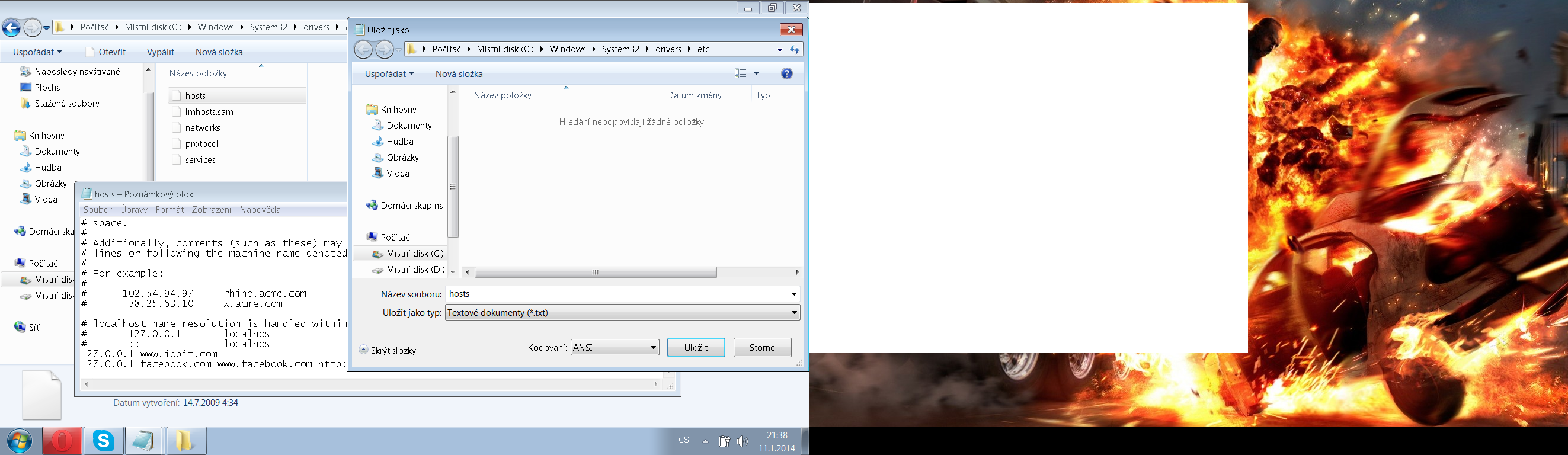 No jo, je to blbý... hosts súbor nemá príponu. Notepad Ti tam dáva uložiť ako *.txt... Pri ukladaní vyber "všetky súbory", nie "textové dokumenty *.txt".