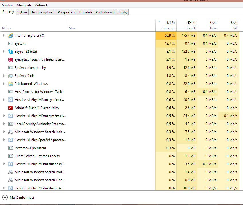 Dobrý den, prosím vás o radu. Cca před měsícem mi začal hodně blbnout notebook. Konkrétně HP Pavilion. Ze začátku jsem to neregistroval jinde,jen u skypu. (začal se nehorázně sekat,po chvíli co byl spuštený se sekl,a ani jiné verze nepomohly.) Jenže časem už nešel ani otevřít. Podíval jsem se tedy do procesu které běží a co já nevidím. Zatížení procesoru 99% a je jedno jestli je to skype nebo něco jiného. Vypnu skype zapnu internet a opět zatížení 99% Chvilkama mi to samé dělá i disk. Říkal jsem si,mohl by to být vir nebo něco takového a tak jsem to projel antivirem. Zase nic. Tak jsem přeinstaloval celý os do továrního nastavení ale opět to nepomohlo. Mám win 8, RAM 4GB,procesor AMD E1-2500 APU with Radeon(TM) HD Graphics 1,40GHz,64 bitový os. Možná budete tvrdit že je slabý,ale toto mi skutečně nikdy nedělalo. Není možné aby toto dělal pouze skype nebo jen internet. Proto vás prosím o radu, sám už si s tím nevím rady. Přikládám foto.Díky moc