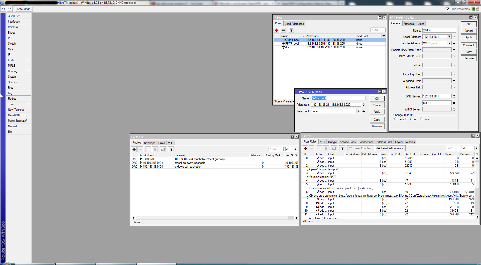 Me porad nejde do hlavy, kam mám v Mikrotiku napsat veřejnou IP adresu, kterou mi přidělil poskytovatel a "svázal" jí s privátní adresou 10.109.109.169. Pokud se chci na mikrotik připojit z venku pomocí ssh, třeba z práce, tedy na adresu 81.201.X.Y, tak vše funguje. I přes nmap vidím port 22 otevřený, stejně tak funguje port 80 a můžu tedy využít pro nastavení Mikrotiku webové rozhraní z práce, "kavárny", ... Ale port 1194 pro OpenVPN zobrazen není.