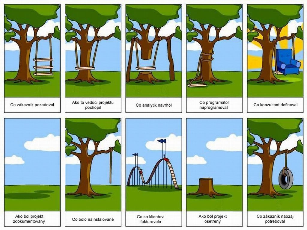 No a ak ťa zaujíma, ako je to v praxi, tak obchodník predá zákazníkovi modré z neba. Projekťák podľa toho nastaví plán, hoci tuší, že sa nevojde do rozpočtu a/alebo do deadlajnu. Analytici vydolujú zo zákazníka (ktorý nikdy nevie, čo chce) špecifikáciu, presnejšie jej prvú verziu. Architekt to celé navrhne po technickej stránke a potom dáva celé dni a noci dokopy ten domček z karát, ktorý postavia programátori. Programátor len píše kód.
