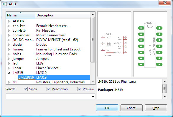 Součástky přidáváš do schématu z knihoven, které jsou jednak součástí Eaglu (adresář Lbr), jednak si další knihovny můžeš vytvářet sám. Spolu se "schématickou" součástkou se přidává do automaticky vytvářeného výkresu plošného spoje i pouzdro součástky s propojením podle schématu. Pokud má součástka přiřazeno více pouzder (např. u kondenzátoru či rezistoru je jich několik desítek), tak si při umisťování součástky do schématu zároveň musíš vybrat i jedno z možných pouzder. Pochopitelně, kdykoliv se ti zlíbí, můžeš pouzdro změnit.