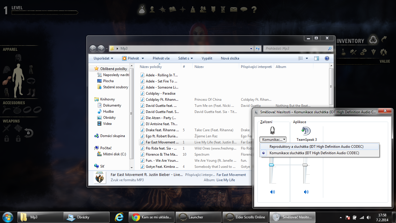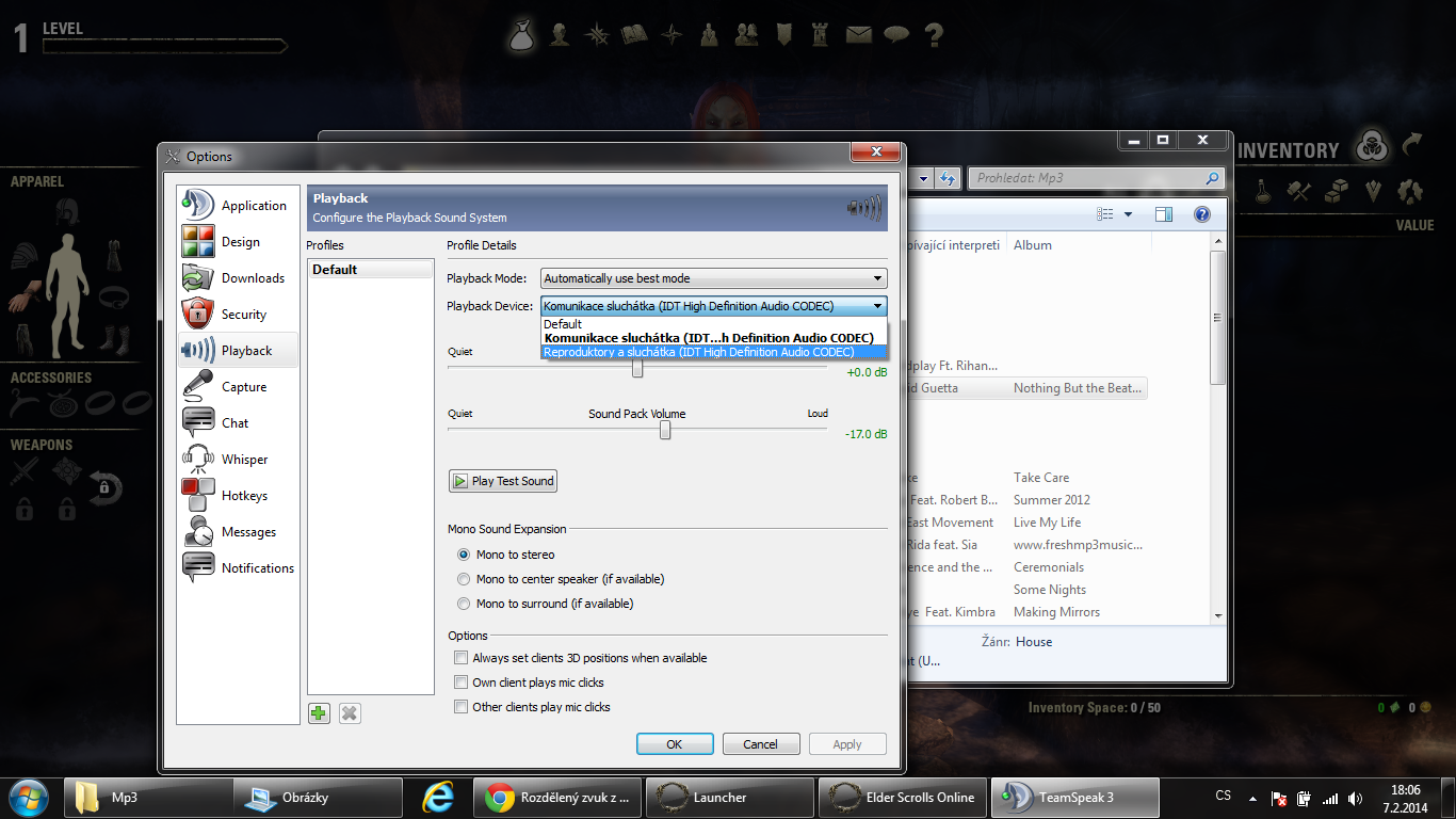 Dobrý den, mám problém. Chci hrát s přáteli online hru po Teamspeaku. Ale v okamžení kdy zapnu Teamspeak, tak se mi do sluchátek začne přehrávat jen zvuk z TS a veškeré ostatní zvukové stopy mi začnou hrát v reproduktorech na Noťasu. A ani za boha to nemůžu sloučit jen do sluchátek...